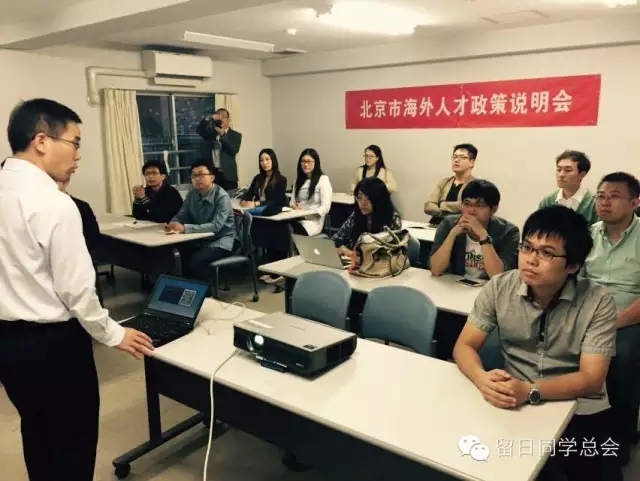 中国留日同学总会关西分会负责人姜康董在宣讲会上致欢迎辞。北京海外学人中心访日团在宣讲会上对北京市“海聚工程”等海外留学人才引进项目进行了介绍,同时对北京市创新创业环境、市属企业的岗位需求等进行了说明。